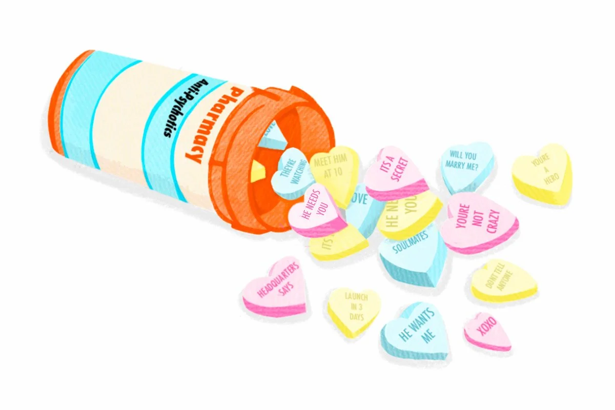 Inspired by the New York Times Modern Love essay My 11-Year Relationship That Never Happened, this illustration plays with the story’s themes of imagined intimacy and delusion. Conversation hearts are reimagined as anti-psychotic pills, creating a kitschy yet poignant visual that reflects the surreal, bittersweet nature of a decade-long episode.