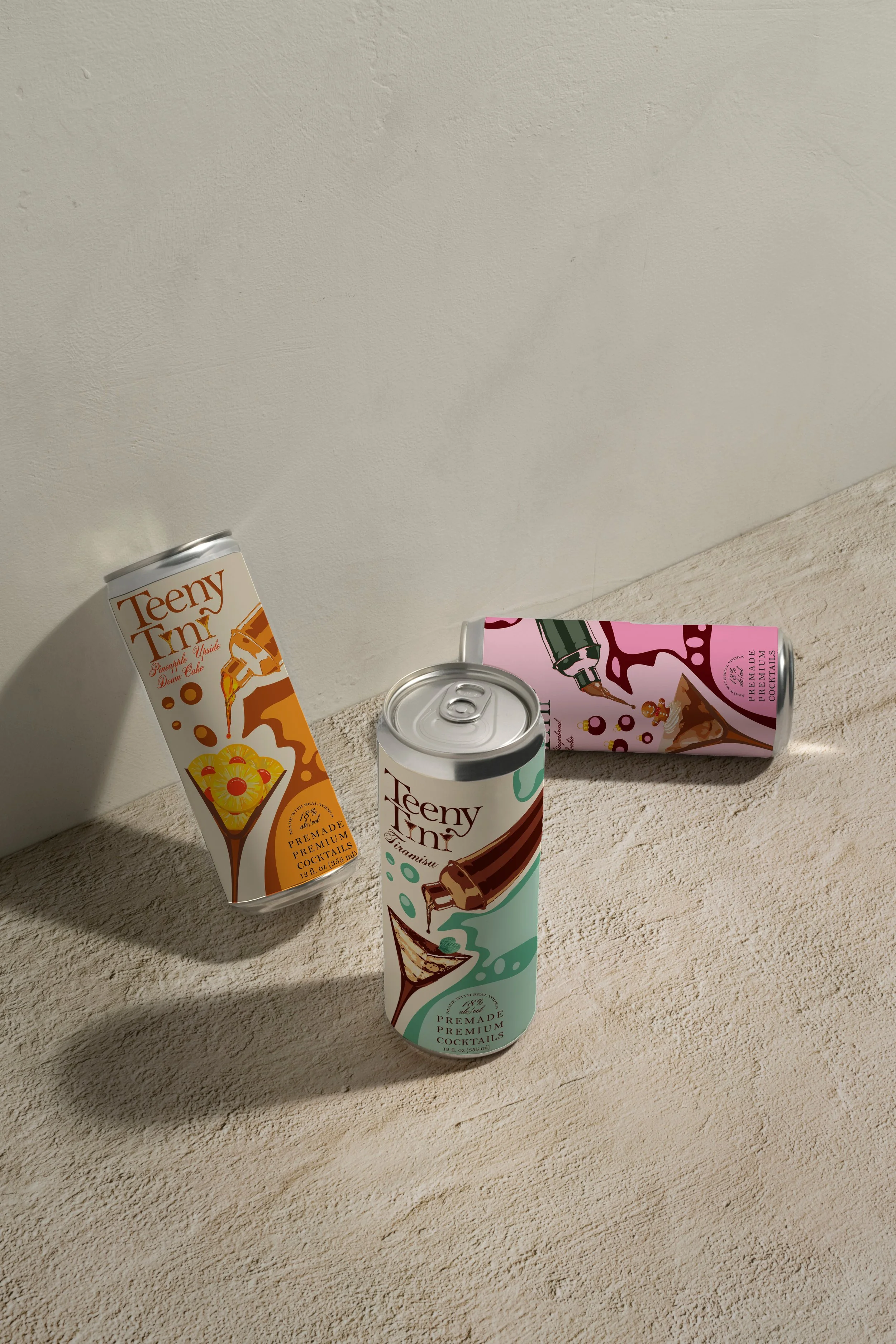 This packaging design for Teeny Tini uses bold colors and whimsical visuals to capture the fun, carefree vibe of pre-mixed martinis, with each flavor’s personality brought to life through vibrant, modern design.