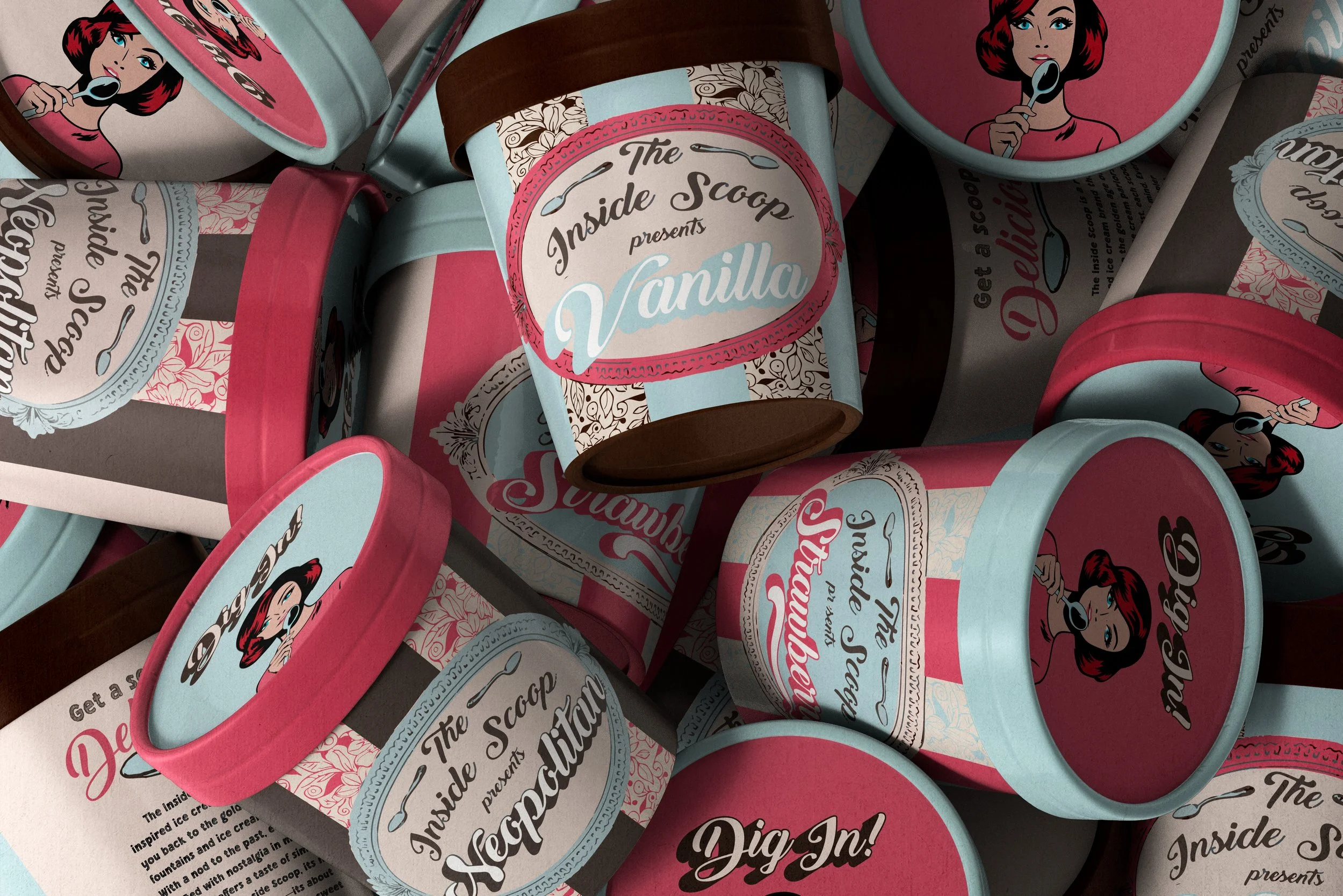 This packaging design for Inside Scoop channels 1950s nostalgia with pastel colors, retro typography, and vintage-inspired imagery to evoke the playful charm of classic ice cream parlors and create a warm, feel-good brand experience.